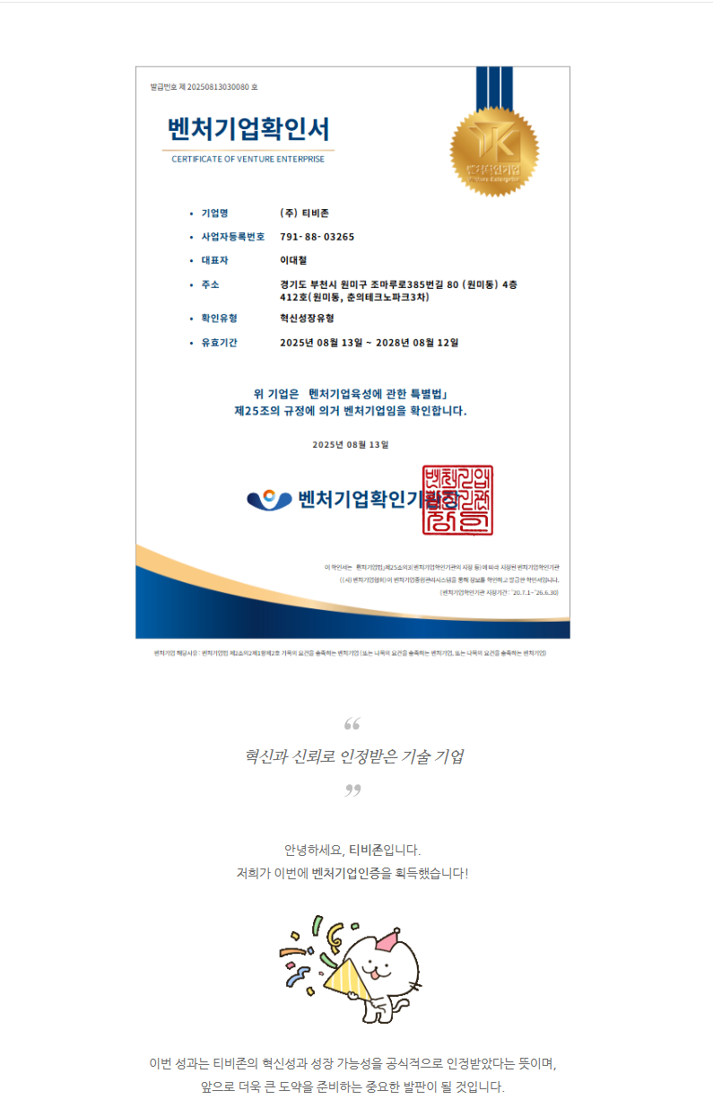 공지 2025년 '벤처기업 확인서' 인증 획득!!! 페이지 정보 작성자 관리자 작성일25-08-19 11:15 조회418회 댓글2건 관련링크 다음글 검색 목록 본문 국가가 인정한 기술력 (주)티비존, 벤처기업인증 획득!!!!! 댓글목록 관리자님의 댓글 관리자 작성일 25-08-19 11:18 최고!!!! 최고!!!! 관리자님의 댓글 관리자 작성일 25-08-19 11:20 https://blog.naver.com/dclee2346/223974343744 https://blog.naver.com/dclee2346/223974343744 다음글 검색 목록